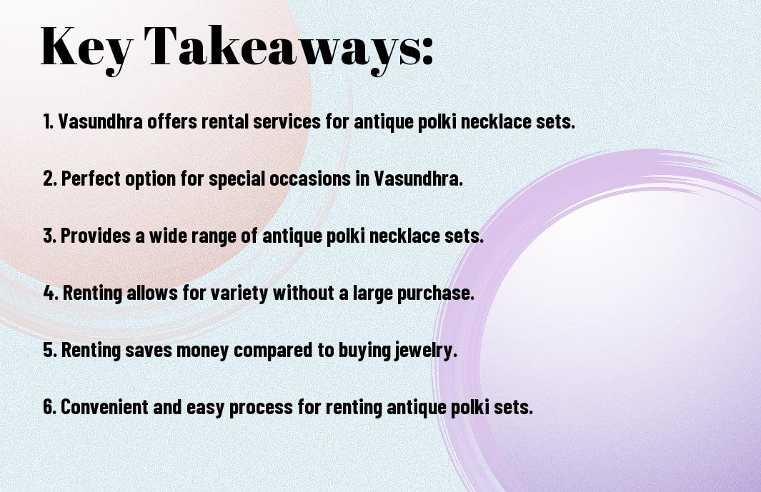There’s a hidden gem in Vasundhra where you can rent a stunning antique Polki necklace set for your special occasion. Let me guide you on how to find this exquisite piece of jewelry that will elevate your look and make you stand out from the crowd. With the right accessory, you can make a statement without breaking the bank. Read on to discover the perfect place to find your dream Polki necklace set!